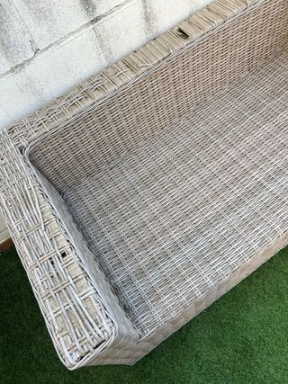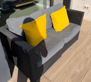 Sofá de dos plazas perfecto para tu terraza o jardín. Su diseño moderno y materiales resistentes lo hacen ideal para exteriores. - Estructura de mimbre. - Cojines de tela en color gris desefundables ( fundas IKEA grises). Se vende sin cojines amarillos