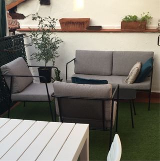 Solo hasta el 1 de abril Conjunto de muebles de exterior con sofá, dos sillones y mesa baja. Estructura metálica y cojines de espuma con fundas de tela gris. Están en buen estado, aunque la tela ha perdido algo de color por el sol y algunas piezas tienen alguna mancha. Los cojines son desenfundables y el forro se puede lavar en lavadora. Sofá 132 cm ancho x 62 cm fondo Sillones 63 cm ancho x 59 cm fondo Mesa 90 cm largo x 50 cm ancho x 40 cm alto Se recoge cerca del metro La Latina. No se hacen entregas