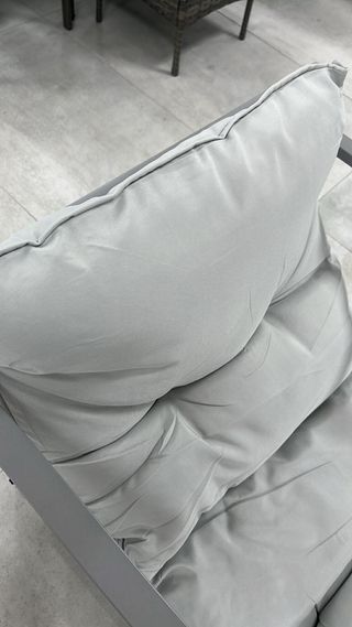 Sofá de dos plazas para terraza o balcón. Su diseño moderno y materiales resistentes lo hacen ideal para exteriores. Tiene una funda/Cojín blanca q se puede poner o quitar (yo lo uso más sin ella). La funda tiene manchas de lluvia (ver fotos) - Estructura metálica. - Asiento y respaldo de tela.