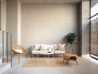 Conjunto de mobiliario para terraza o balcón. - Mesa redonda con sobre de cristal. - Cuatro sillones de mimbre con cojines. - Diseño rústico y elegante. -Mesa de cristal junto con sofá mimbre