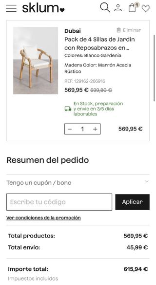 Pack de 4 Sillas Dubai de Sklum nuevas, sin estrenar. Fabricada en madera de acacia con acabado cepillado, que le otorga gran durabilidad y resistencia. Diseño trenzado en cuerda en el respaldo y el asiento. Cómodos cojines desenfundables confeccionados en poliéster; el del respaldo con relleno de fibras sintéticas, y el del asiento relleno en espuma e incluye unas bandas antideslizantes debajo, que evitan que se mueva. Las patas incluyen tacos de caucho para proteger el suelo. 2 TIENEN LA CHAPITA DE SKLUM Y 2 NO (FOTOS 7 Y 8) NO ENVÍO # mueble muebles terraza exterior exteriores regalo barato barata baratas #