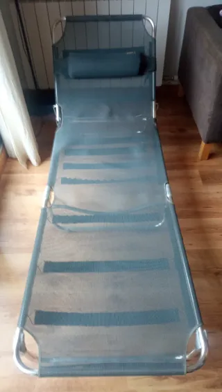 Tumbona hamaca ideal para playa o jardín. Es plegable y de aluminio, lo que la hace ligera. - Material: Aluminio (poco peso) - Prácticamente nueva (sin usar) - Medidas: Largo 1,90 m, Ancho 0,58 m - 4 posiciones - Incluye parasol (poner y quitar) - Medida plegada: Largo 0,80 m, Ancho 0,15 m - Se vende por 50 - Precio original Hipercor: 79,95