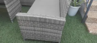 Set de muebles de jardín de ratán gris con sofá ideal para exterior. Incluye cojines y respaldos ( están guardados no aparecen en imagen ) , se vende por mudanza ( completamente nuevo no tiene ni 3 meses ) incluye 2 asientos individuales - Sofá modular - Mesa de centro con cristal. - Cojines de asiento y respaldo. - 2 asientos individuales incluidos