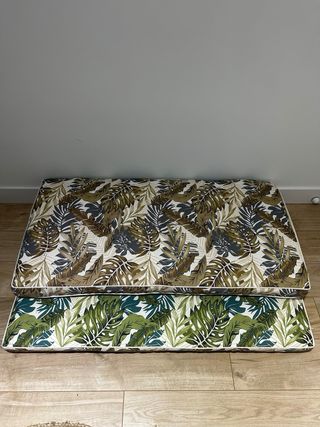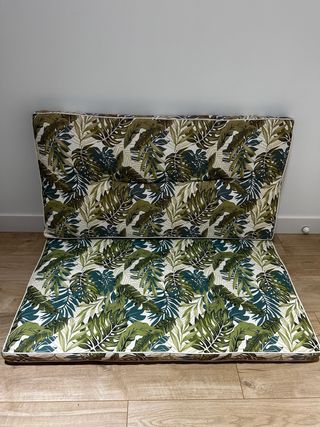 Conjunto de cojines para palets con un llamativo estampado de hojas tropicales. Están en perfecto estado y con poco uso, son muy cómodos y mullidos. El único defecto que tienen es que por un lado han perdido el color por el sol, como se puede ver en las fotos. - Diseño de hojas verdes y multicolor. - Funda de tela resistente.
