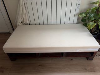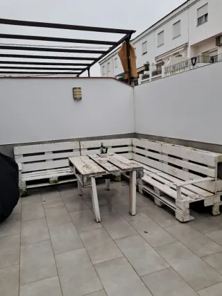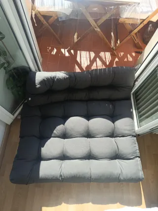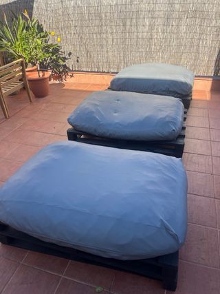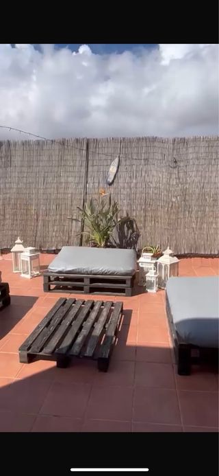 Conjunto de sofá para terraza hecho con Europalets (los más resistentes que hay), con cojines color lino Medidas: 120x80 - Base de palets de madera lijados, cepillados y barnizados. (Precio original de los palets 30€/unidad) - Cojines de tela repelente al agua en color lino de Leroy Merlín, son desenfundables y lavables en lavadora. (Precio original del juego de cojines (100€) Tienen muy muy poco uso. Se pueden vender por separado (50€los palés o 50€ los cojines)