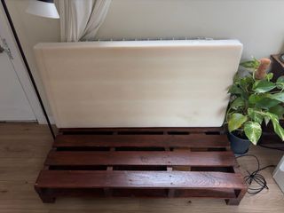 Sofá bajo hecho a mano con palets de madera, ideal para un estilo rústico o industrial. Incluye un cómodo cojín. - Estructura de madera robusta. - Cojín de tela en tono beige.