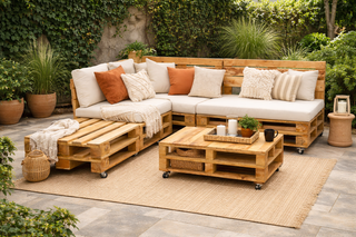 Conjunto de mobiliario de exterior o interior hecho con palets de madera. - Diseño modular para configurar a tu gusto. - Incluye ruedas para facilitar el movimiento. - Ideal para crear un espacio chill out.
