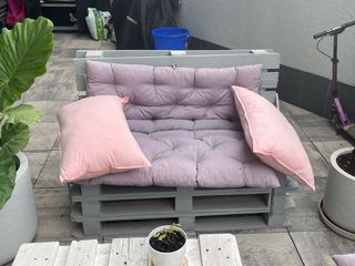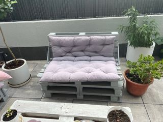 Se vende sofá de palets rinconera, por un lado tres plazas y dos en el otro con respaldar. Junto con cojines morado echos a medida.