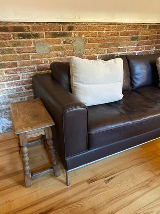 Sofá de piel de Ikea en color marrón. Un mueble elegante y cómodo para tu salón. - Diseño moderno y líneas limpias. - Patas metálicas finas.