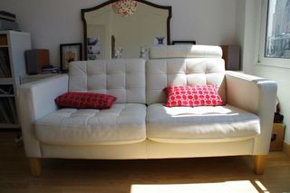 sofá ikea blanco de piel sintética, es cómodo y funcional. Está gastado, pero con una funda o una tela por encima queda bien, como en las fotos. Es bajito porqué va sin patas, pero se le pueden poner, al ser de ikea no es difícil encontrar unas. Lo vendo sin manta y sin cojines. Cualquier cosa me puedes preguntar! Para llevartelo tienes que bajar dos pisos sin scensor por escalera estrecha, hará falta mínimo dos personas para recogerlo!