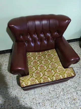 Tresillo vintage, estructura muy robusta, de gran calidad, compuesto de: - Sofá 3 plazas de polipiel/sky. El sky original está deteriorado, para tapizar - 2 Sillones de polipiel/sky en muy buen estado Se encuentra en municipio de la Comunidad, a 35 kms. de Madrid Sólo venta en persona
