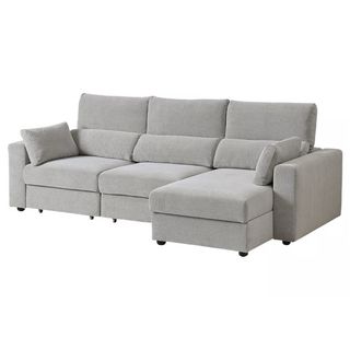 Sofá chaiselongue de tela en color gris, con capacidad para tres o más personas. Las fundas se pueden extraer para poder ser lavadas.