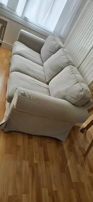 Sofá de tres plazas de Ikea en color beige. Un mueble cómodo y espacioso para tu salón. - Funda extraíble para facilitar la limpieza. - Cojines mullidos para mayor confort. - Diseño clásico y versátil. Esta en perfecta condicion
