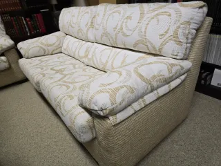 Este sofá de tela aporta un toque elegante a cualquier sala de estar. - Diseño moderno con cojines cómodos. - Patrón de espirales en tonos dorados sobre fondo beige. - Estructura robusta y acabados de calidad.