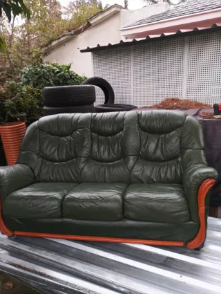 Sofá de tres plazas con un diseño elegante y confortable. - Tapicería de piel. - Estructura de madera. - Color verde oscuro.