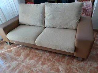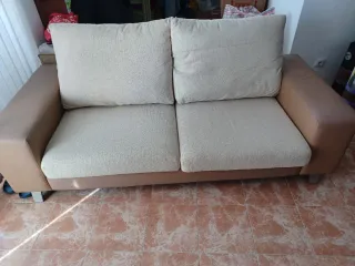 Sofa de tres plazas en tonos beige y marrón. Está en buen estado y es muy cómodo. - Medidas: (Añadir medidas si se conocen) - Tapizado de tela resistente. - Perfecto para relajarse. No se envía, sólo recogida.