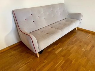 Elegante sofá de tres plazas con un diseño moderno y detalles distintivos. - Ribete decorativo en color rojo. - Patas de madera. Lo vendo por la mudanza.