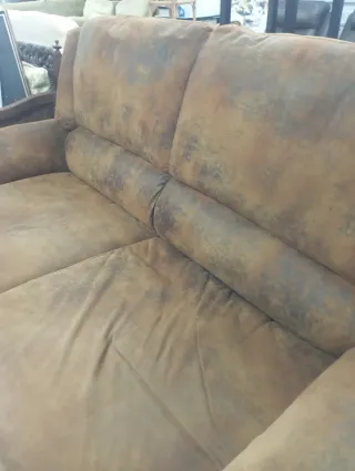 Conjunto de Sofá de dos y tres plazas en piel de color marrón. -Sofá 2 plazas 120. -Sofá 3 plazas 180. Los 2 juntos 250. - Diseño con capitoné en los respaldos. - Reposabrazos curvos. - Base de madera oscura.