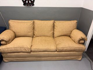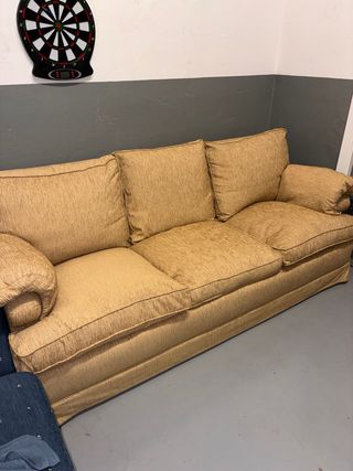 Sofá de tres plazas en un vibrante color mostaza. Añade un toque de calidez y estilo a tu salón. - Diseño moderno y cómodo. - Tapicería de tela. - Estructura robusta. Venta en persona y recogida en la vivienda