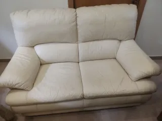 Sofá de piel de vaca de tres plazas en color beige. Un mueble cómodo y elegante para tu salón. Sofá grande piel vacuno 190 x 90 cms Sofá pequeño 150 x 90 cms - Tapicería de piel de vaca. - Diseño de tres plazas y dos plazas RECOGIDA EN PERSONA. EL COMPRADOR SE ENCARGA DE LA RECOGIDA