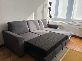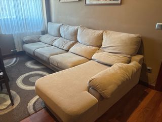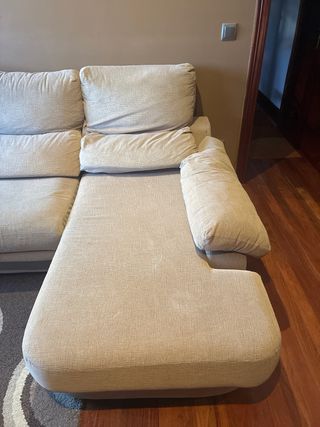Sofá chaise longue de tres o cuatro plazas. Tiene 2 años y pico, poco uso y está como nuevo. Se ha tratado con mucho cariño.
