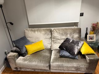 Sofá italiano de dos/tres plazas en buen estado, con fundas lavables para mayor comodidad. - Tapicería de terciopelo suave. - Diseño moderno y elegante. - Color que pega con todo pero le da un toque. - Cómodo