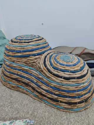 Original puf de Ikea con un diseño espiralado y bicolor. - Tejido trenzado de mimbre y ratán. - Tonos naturales y azules. - Forma curva y orgánica.