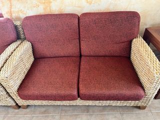 Acogedor sofá de dos plazas con un diseño natural y moderno. - Estructura tejida en mimbre. - Cojines en tono rojo intenso. - Patas de madera discretas. - Hay 3 sofás iguales - 70€ cada uno No hago envíos Las tres 180€