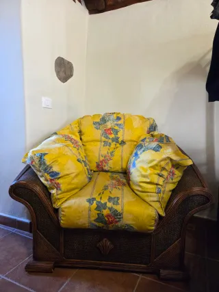 Conjunto de sofás. - Tapicería en tela con estampado floral. - Estructura de mimbre. - Cojines de plumas cómodos. MEDIDAS: 1 sofá de 3 plazas: 1,95 m de largo 2 sofás individuales: 1,11 m de largo cada uno PRECIO: Los tres juntos: 300 € Opcional venta individual: Sofá 3 plazas: 200 € Sofás individuales: 100 € cada uno