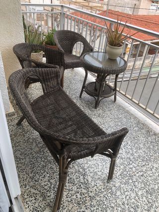 Conjunto de muebles de exterior para terraza o balcón. - Incluye dos sillas de mimbre. - Un sofá de mimbre. - Una mesa auxiliar con tapa de cristal.
