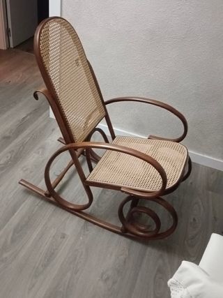 Mecedora de mimbre, recién reparado el asiento. Sin uso desde la reparación. Está completamente nueva. Está nueva cuesta los 500 euros.
