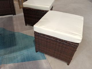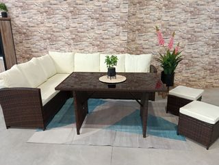 Preciosa y moderna conjunto de muebles de terraza. Incluye sofá rinconero, mesa de centro y dos pufs. Perfecto para disfrutar del buen tiempo. - Estructura de mimbre marrón. - Cojines beige. - Ideal para jardín o balcón. - A estrenar, con garantía. ☎ INFO al 673*317*361 👀¡Entra en mi perfil para ver otros productos en Oferta!” 💰 Pago contra reembolso. 💯 Garantía de 03 años. 🚛 Consultar costo de envío 💷 Financiación hasta en 12 meses #Terraza #sofádejardín #Mesaparaterraza #Mesaparajardín