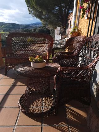 Conjunto de mobiliario de exterior. Sofásby sillones de mimbre junto con mesa de centro, en perfecto estado. - Sofá de mimbre. - Mesa auxiliar de mimbre. - Dos sillones de mimbre. Se puede llevar a donde gustes por un poco más, solo consultame.