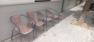 Se venden cuatro sillas de exterior en buen estado. Son ideales para una terraza o jardín. - Estructura metálica. - Asiento y respaldo de mimbre trenzado. - Color beige y gris.