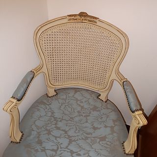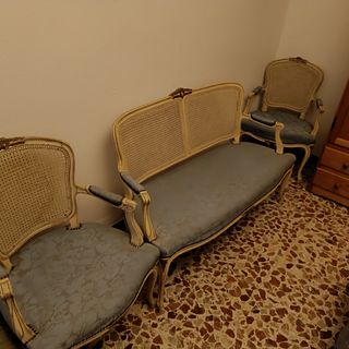 Conjunto de muebles antiguos compuesto por un sofá de dos plazas y dos sillones individuales. Son de estilo clásico, con una estructura de madera y detalles en mimbre. Tapicería en tela azul. Muebles elegantes y con encanto, ideales para dar un toque vintage a tu hogar. - Estructura de madera - Asientos tapizados (necesario restautar por dentro,por fuera perfectos) - Respaldos de mimbre