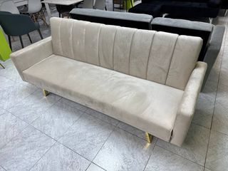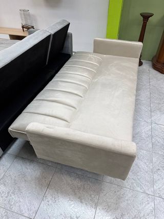 envíos a domicilio y pagos en la entrega. Sofá completamente nuevo tapizado en terciopelo. Incluye 2 bolsillos laterales y 2 cojines a juego. Se hace cama facilmente, es muy practico. Si quieres mas información, medidas o fotos, escribeme.