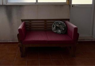 NO HAGO ENVIOS. Recogida en Alcalá de Guadaira. Sofá de dos plazas perfecto para exteriores. Tiene varias posiciones, hamaca, sofa...Su diseño combina madera y tela para un toque acogedor. - Estructura de madera resistente. - Cojines de tela en color rojo.
