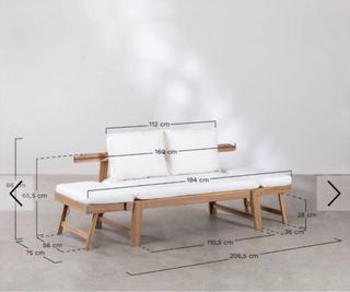 Sofá cama de tela con patas de madera. Las medidas indicadas son del sofá cerrado. Se recoge en Bellavista.