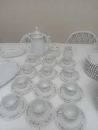 Elegante vajilla de porcelana,consta de 68 piezas. con un delicado diseño floral en tonos rosas y blancos. Ideal para realzar tus comidas. - Piezas con borde decorado con flores. - Diseño clásico y elegante. 4 bandejas diferentes tamaños. 12 platos hondos. 12 platos postre. 12 platos llanos grandes. Sopera. Juego de café ( 12 tazas,12 platos), tetera ,lechera y azucarero.. Nueva sin estrenar,de porcelana de Santa Clara Ikea, playa,sofá, cama, armario, playa