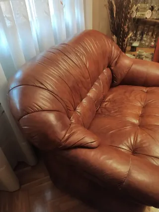 Cómodos sofás, uno de tres plazas y otro individual, con mecanismo reclinable manual. Tapizados en piel. - Estructura robusta. - Diseño moderno y elegante. - Asientos confortables. Tienen desperfectos que se ven en la foto, también incluyo fundas de tela negra para el de 3 piezas, de forma que los desperfectos no se ven. El sofá individual no tiene desperfectos