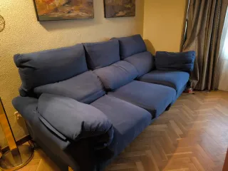 ACEPTAMOS OFERTAS Sofá chaiselongue de tela en color azul. Esquinero muy amplio - Tapicería de tela. - Reposacabezas con inclinación completamente regulable - Asientos desplegables - Taburetes (nunca usados) incorporados, se pueden esconder como parte del sofá. - Chaiselongue fijo con enganche - Diseño moderno. - 6 plazas aproximadamente. - Pequeñas marcas de uso. - Tiene muy pocos años. Medidas del sofá completo: Largo 2.7 m Ancho 90 cm Largo chaiselongue (esquina) 1.6 m Ancho de esquina 94 cm Se vende porque es demasiado grande para mi salón.