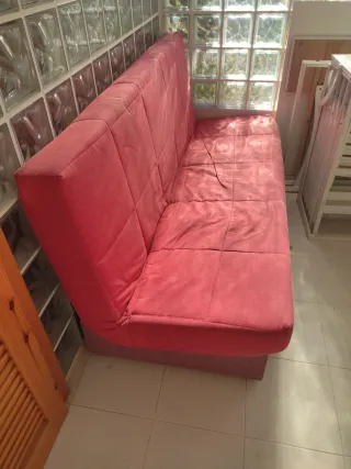 Sofá cama de tela en tono rosa, ideal para cualquier espacio. - Diseño moderno con líneas limpias. - Base firme y cómoda.