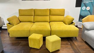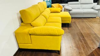 Sofá Oslo con chaislongue en un vibrante color amarillo. Su diseño moderno y cómodo lo hace ideal para cualquier salón. - 2 asientos de 78cm deslizantes - arcon en los dos brazos -brazo modo siesta 2 banquetas extra - Tapicería de tela. - Estructura robusta.