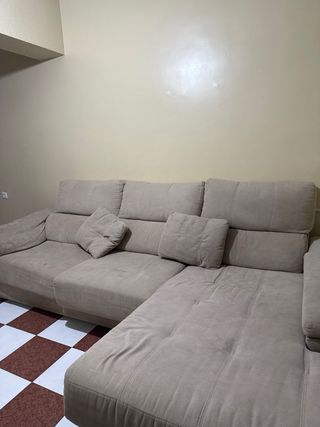 Se vende chaiselongue de 3 metros de largo y con una L de 1,65m, tapizado en tela repelente a la suciedad, arcón en el lateral y dos puff. Tiene alguna marca de uso.