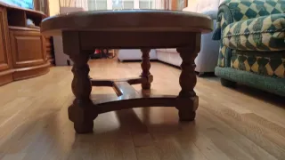 Elegante mesa baja para el salón con un diseño moderno. - Tablero de cristal blanco. - Estructura de madera en tono beige. - Patas robustas. Como se aprecia puede levantarse la parte central para tener un uso quizás de picoteo en sofa.
