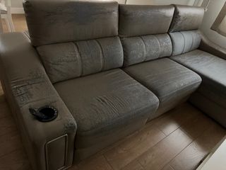 Cómodo sofá chaiselongue con un diseño moderno. - Tapicería de tela. - Color beige neutro. Dos asientos reclinables eléctricos. El chaislonge se abre para guardar mantas etc.. Uno de los asientos tiene una almohadilla caída. No afecta cuando está cerrado y cuando está abierto tampoco es un problema serio.
