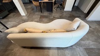 Sofá de diseño moderno con un tapizado en tela que combina tonos beige y grises. Su forma orgánica y curvilínea le da un toque único a cualquier espacio. - Diseño escultural y contemporáneo. - Tapicería de tela texturizada. NO SE HACEN ENVIOS