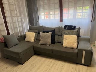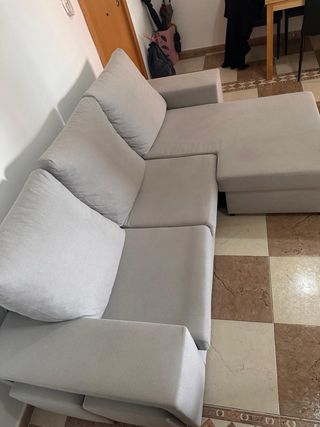 Sofá de 3 plazas con chaise longue abatible. Un mueble elegante y funcional para tu salón. - Chaise longue abatible para almacenamiento extra. - Los 2 sitios individuales también se extraen. Los respaldos son abatibles. - Tiene 2 asientos extraibles en un lateral. - Diseño moderno y cómodo. - Recoger en el domicilio. - Uno de los cojines tiene un agujero, sale en la foto.