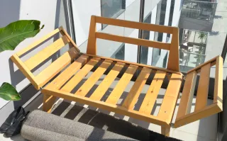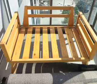 Este sofá de madera es versátil y puede usarse tanto en interiores como en exteriores. Su diseño sencillo lo hace adaptable a diferentes espacios. Se alarga para hacerse cama - Estructura de madera robusta. - Listones de madera en el asiento.