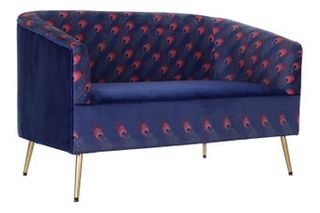 Sofá de dos plazas con un diseño llamativo inspirado en plumas de pavo real. - Estructura de metal. - Tapicería de poliéster. - Medidas: 130 cm de ancho, 70 cm de profundidad y 80 cm de alto. Tenemos disponible 1 U en petróleo turquesa
